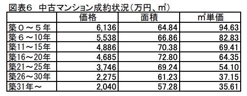 下表は築年数を5年ごとに区切り、マンションの平均成約価格の推移を示したものです。
