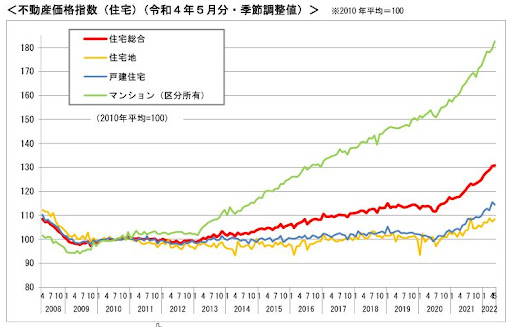 中でもマンション(緑色の線)の価格指数が突出して上昇しているのがお分かりいただけると思います。