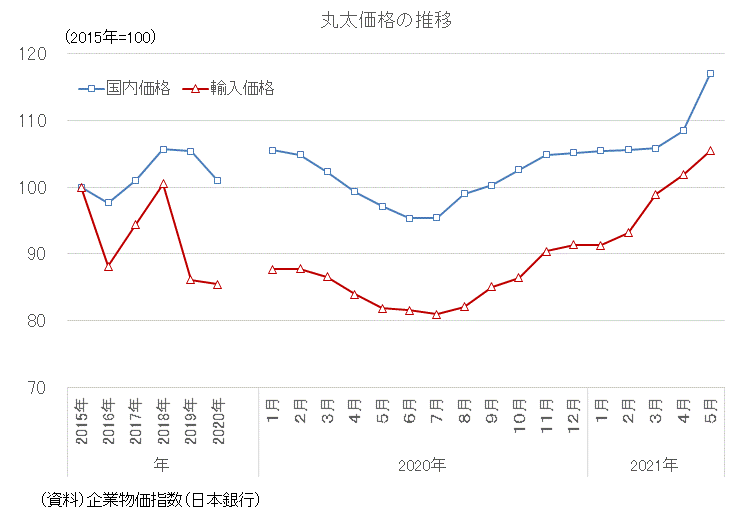 下図は、経済産業省が公表している国内の木材流通価格の推移と製材流通価格の推移を表したものです。