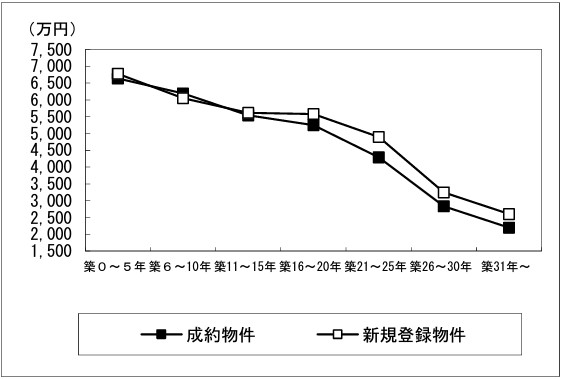 首都圏マンションの築年数ごとの成約状況です。5年を経過すればその分、1,000万円程度売却価格が減少していることが見て取れます。