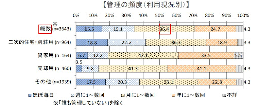 以下のグラフも「令和元年空き家所有者実態調査(国土交通省)」の結果ですが、管理頻度は月に1回から数回、年に1回から数回が半数以上を占めています。