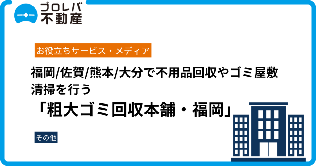 福岡/佐賀/熊本/大分で不用品回収やゴミ屋敷清掃を行う「粗大ゴミ回収本舗・福岡」の公式サイトに、プロレバ不動産が掲載されました。 丁寧な対応が評判、粗大ゴミ回収本舗・福岡 粗大ゴミ回収本舗・福岡とは 「粗大ゴミ回収本舗・福岡」は、福岡県、佐賀...