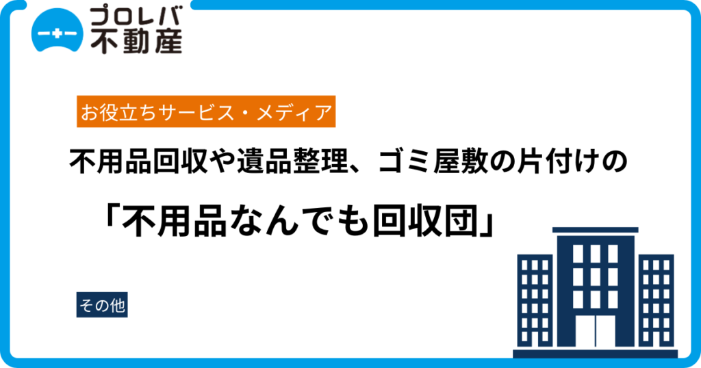 東京都、神奈川県、埼玉県、千葉県を中心に活動する「不用品なんでも回収団」の公式サイトに、プロレバ不動産が掲載されました。不用品回収や遺品整理、ゴミ屋敷の片付けを行う同サービスにて、紹介されています。 不用品回収の全てを任せられる信頼の不用...