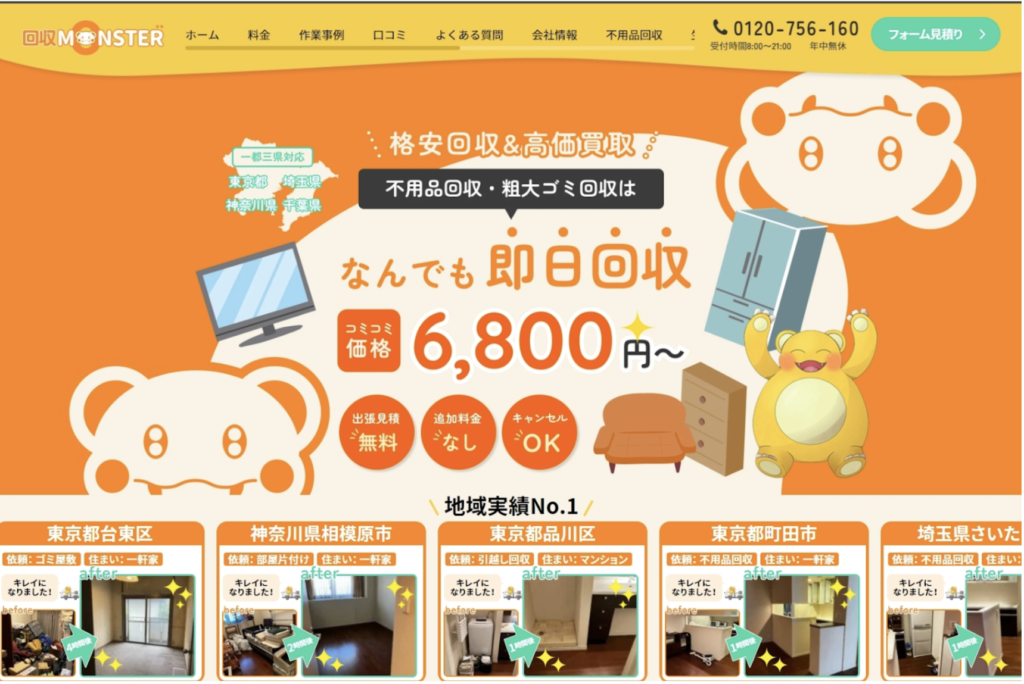 不用品回収モンスターは、手ごろな料金と柔軟な対応で信頼を得ている業者です。SSパックは6,800円から、3Lパックは58,800円からの価格設定があり、買取可能な品物については買取を行い、最終的な回収料金を抑える工夫をしています。最短30分で即日対応が可能で、年中無休で8:00〜21:00まで受付しています。